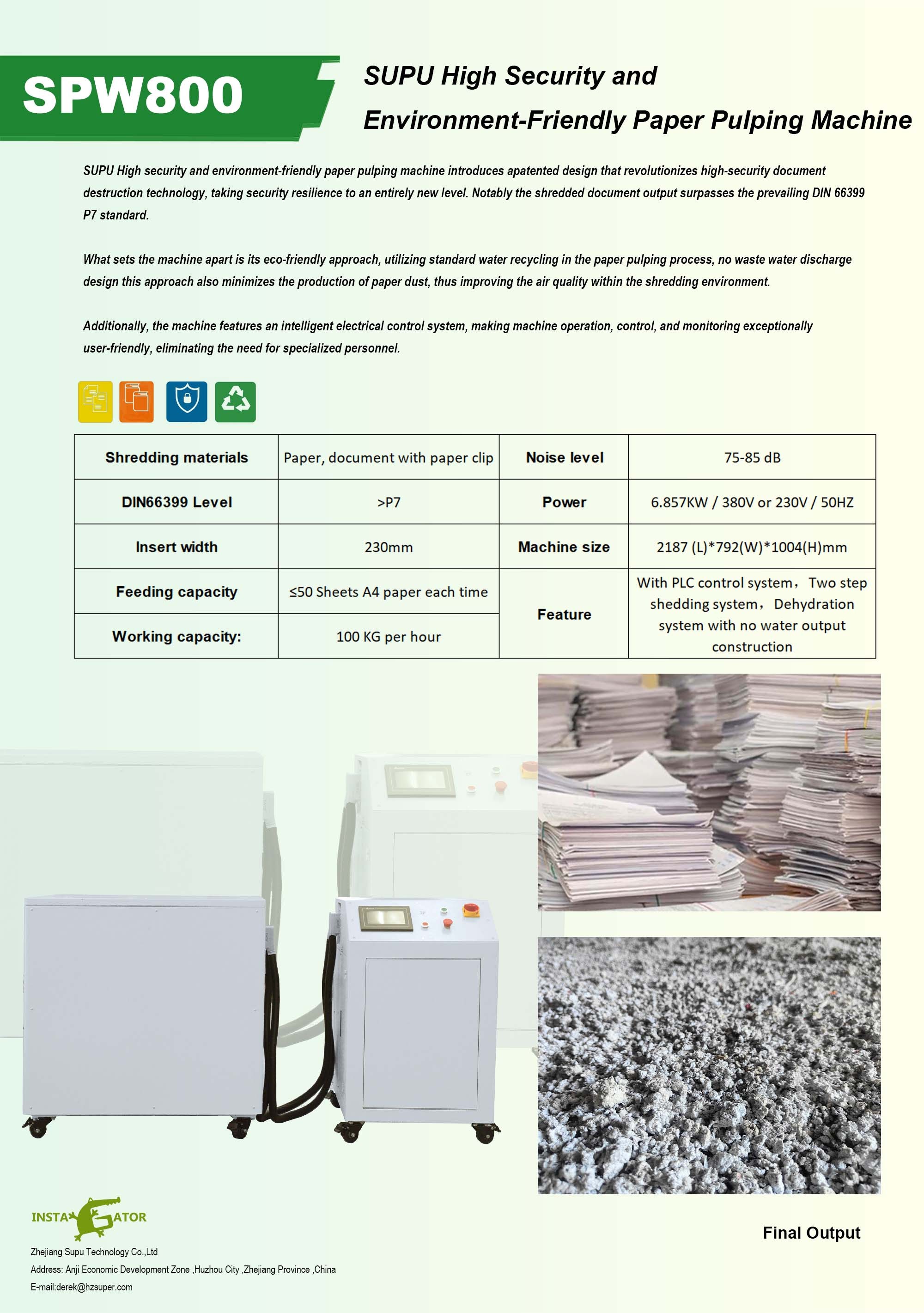 SUPU SPW800 paper pulping machine adopts the patented technology, and the final output material exceeds the safety standard of DIN66399P7.