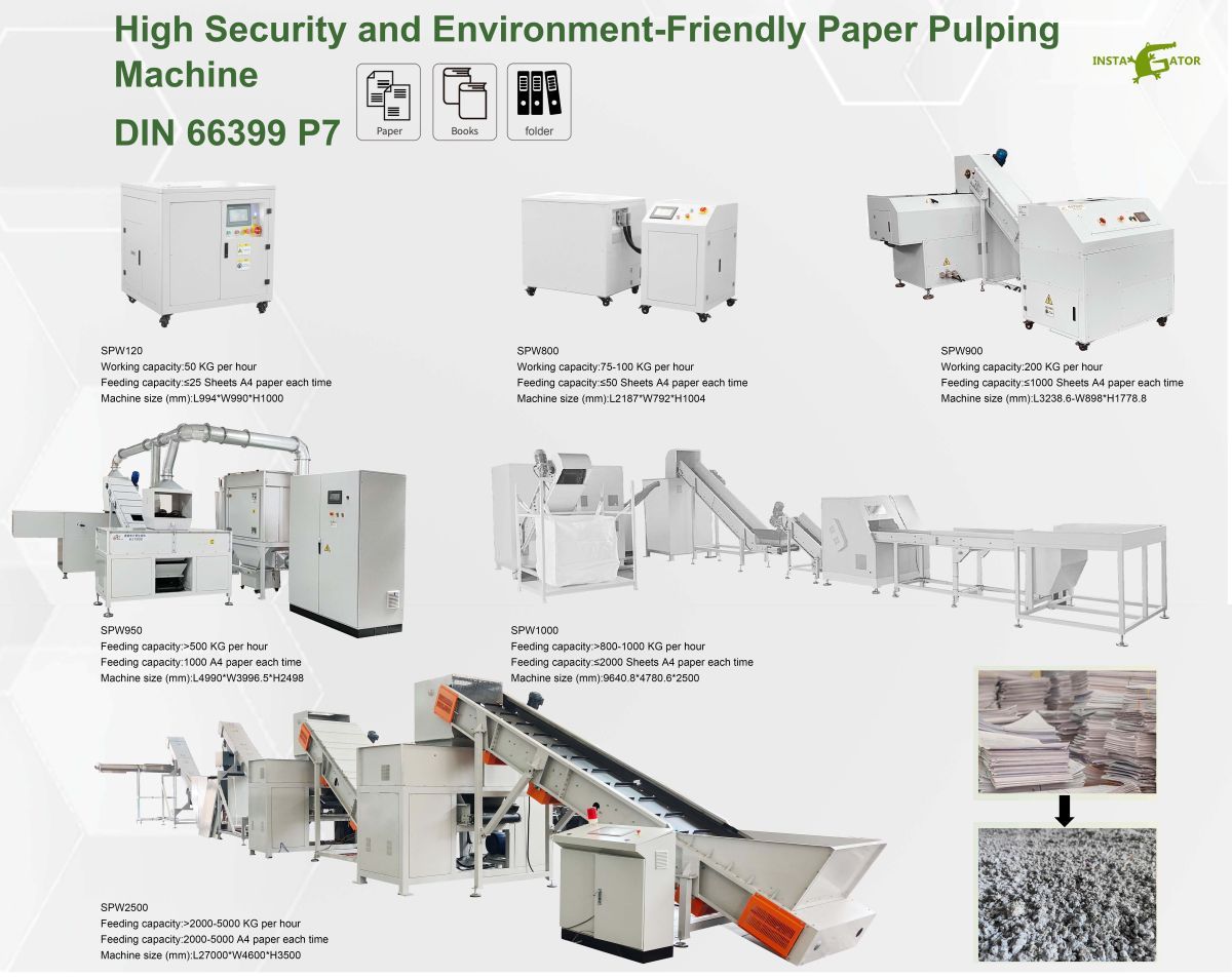 SUPU high security and environment-friendly paper pulping machine introduces patented desigh that revolutionizes high security document destruction technology, taking security resilience to an entirely new level. Notably the shredded document output surpasses thr prevailing DIN66399 P7 standard.